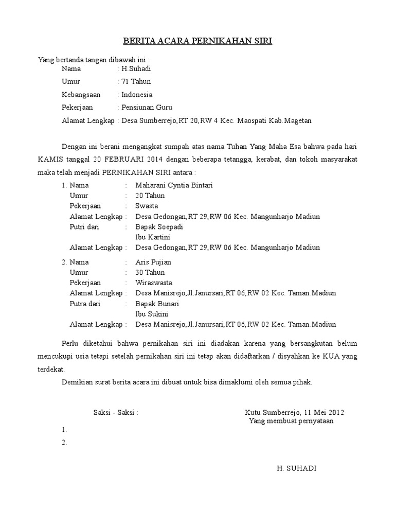 Download contoh naskah perjanjian hibah desa format word atau doc download pdf download word. Contoh berita acara nikah syar'i atau nikah siri. Ingat, contoh surat nikah siri ini bukan untuk mengesahkan pernikahan secara hukum negara, karena untuk memiliki kekuatan hukum negara pernikahan harus tercatat di kua. 10 contoh surat pernyataan cerai yang benar terlengkap. Tapi surat nikah siri ini akan berguna untuk kita mengurus buku nikah setelah nikah siri, dengan mengajukan isbat nikah.